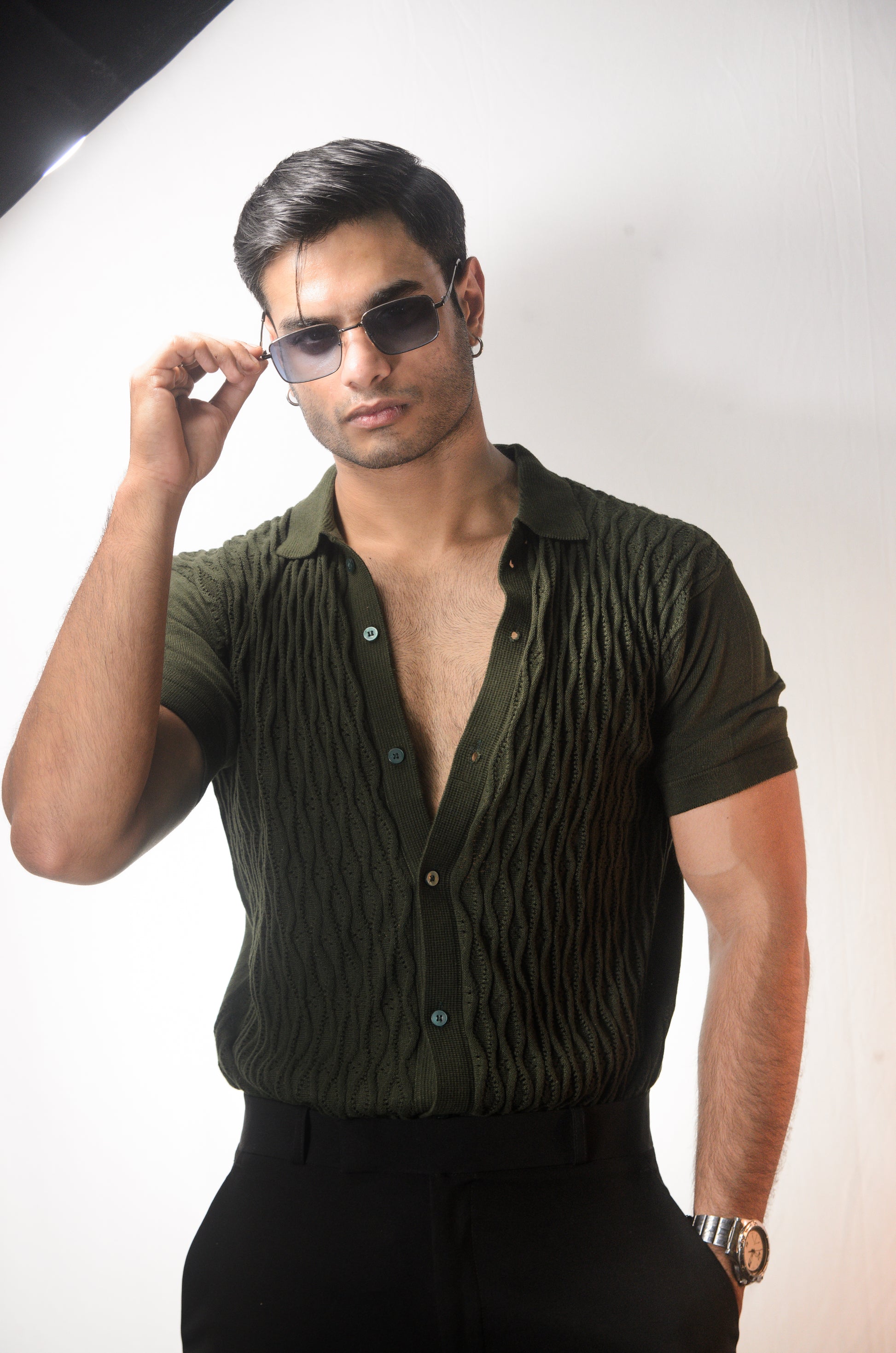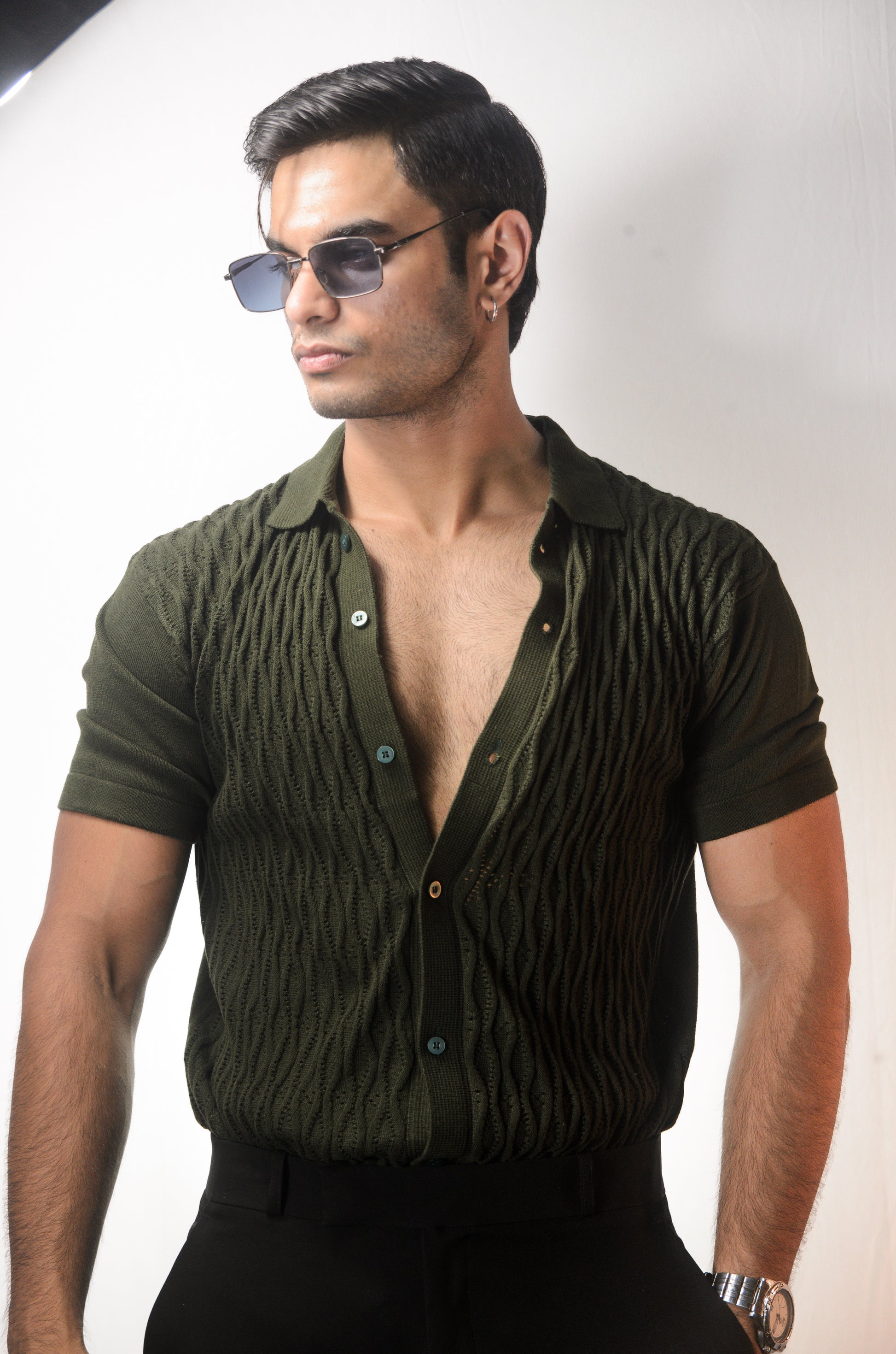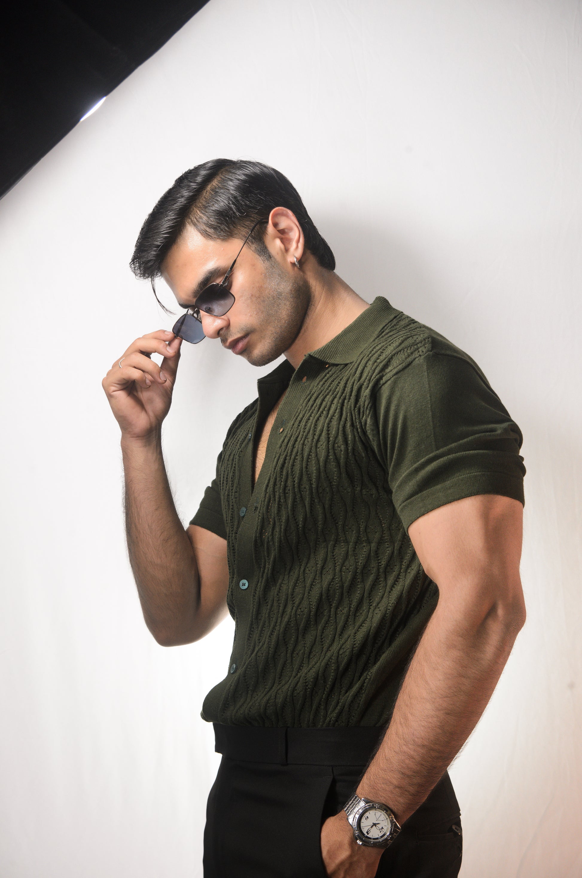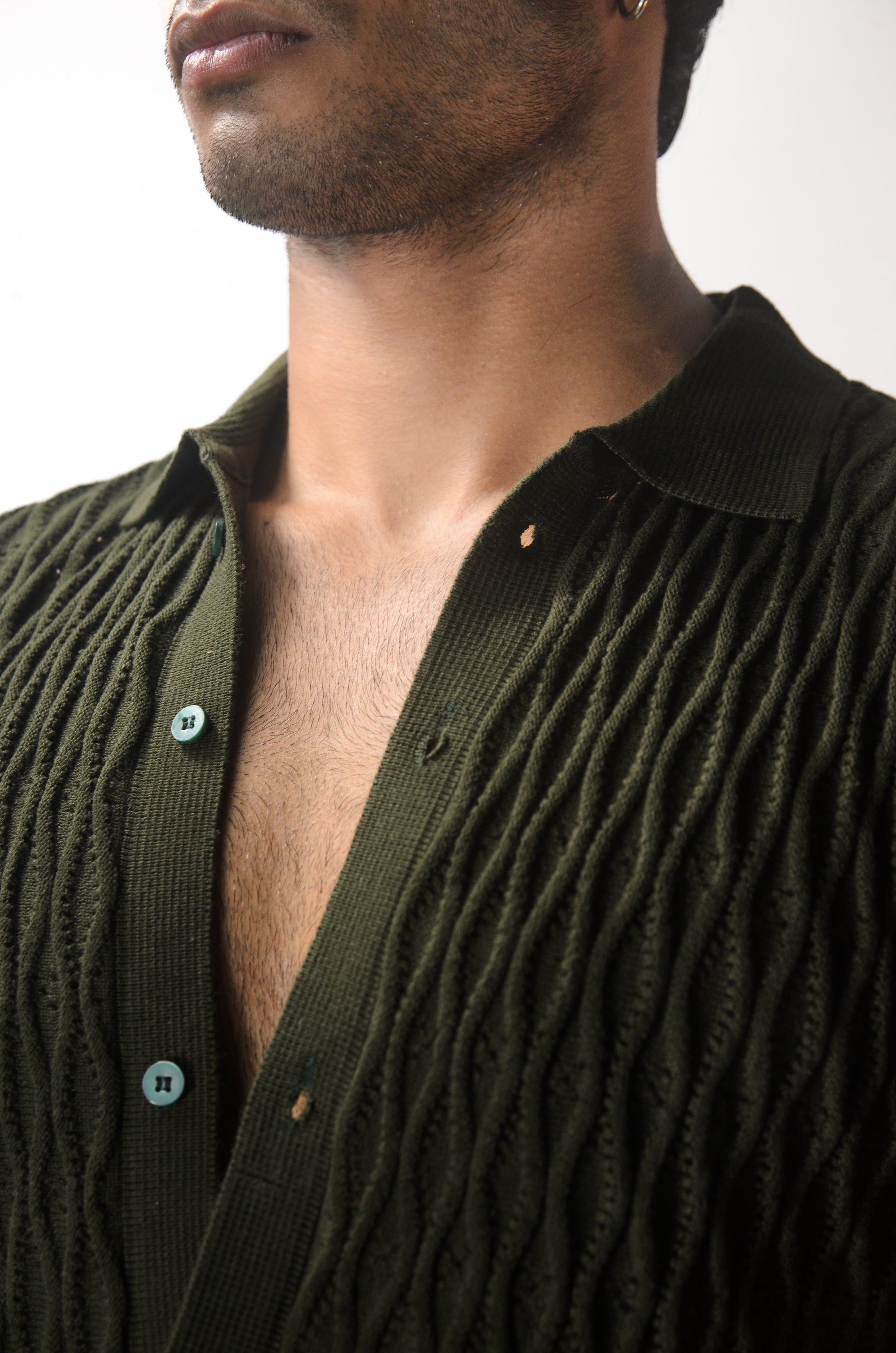 Diamond Stitch Knitted Shirt - OLIVE GREEN