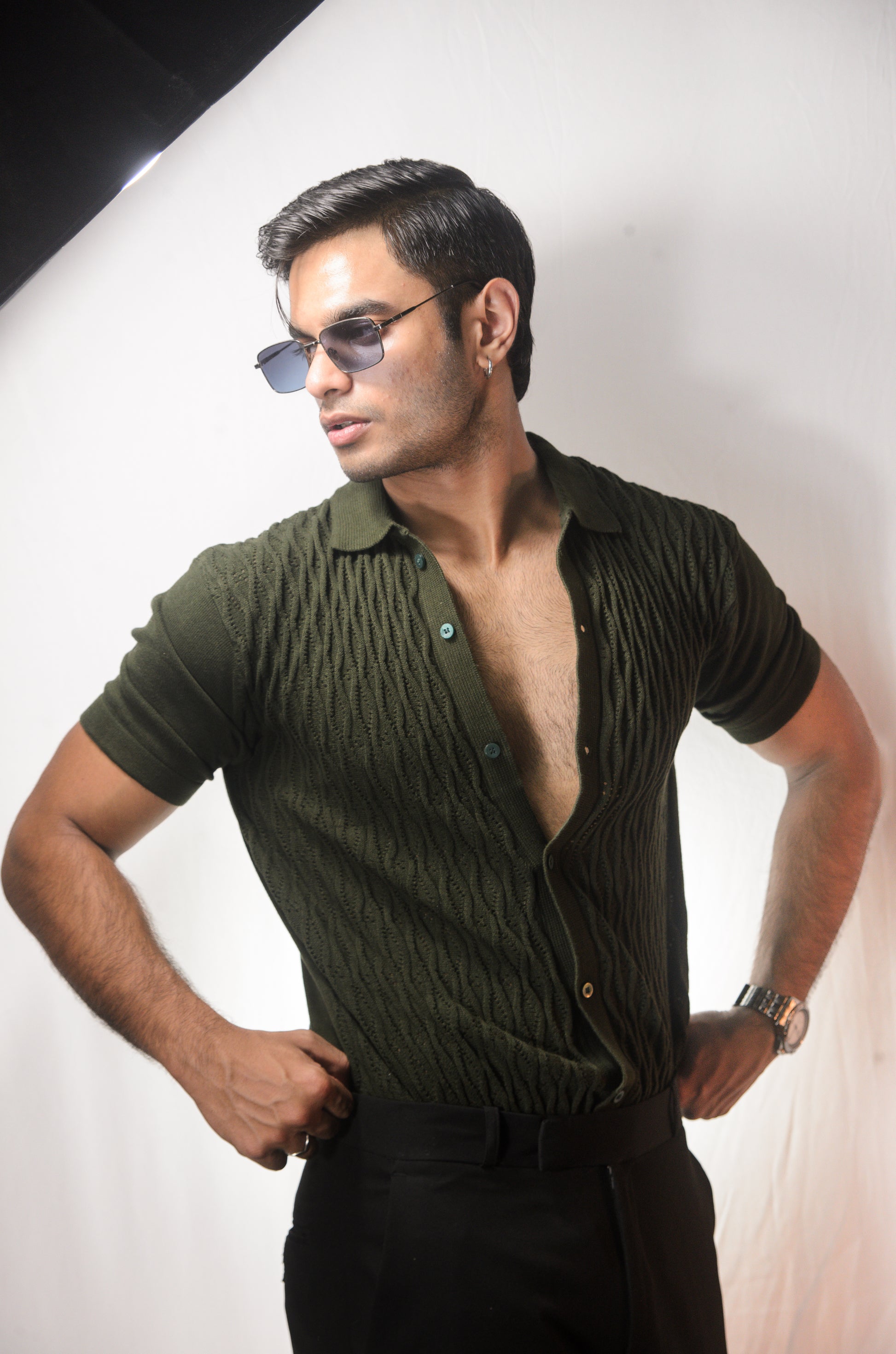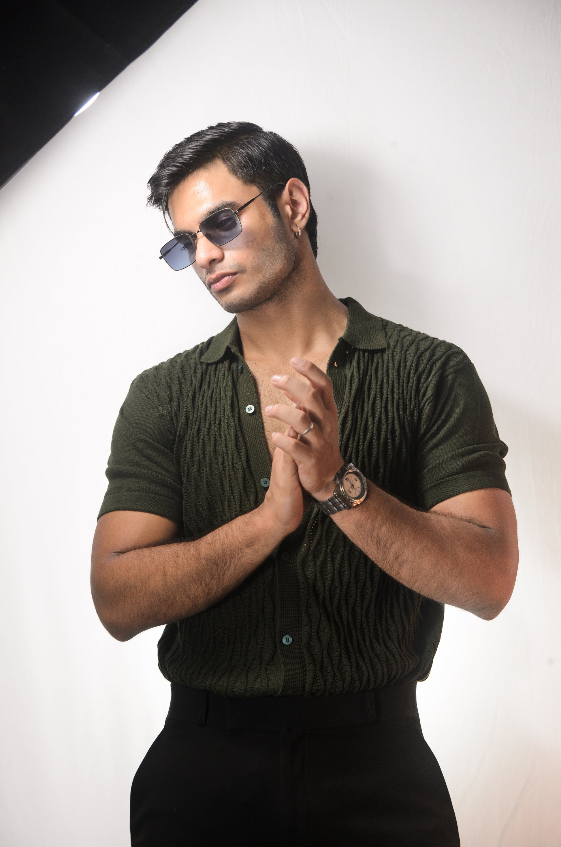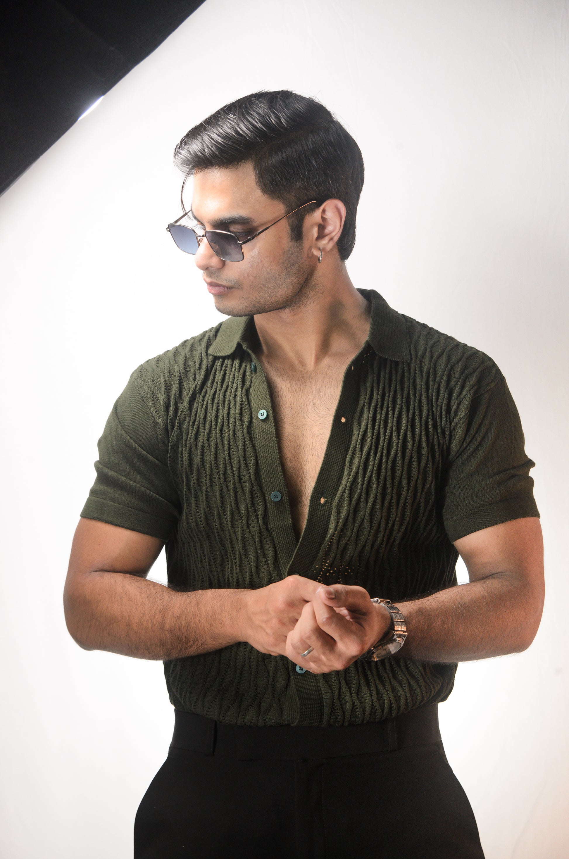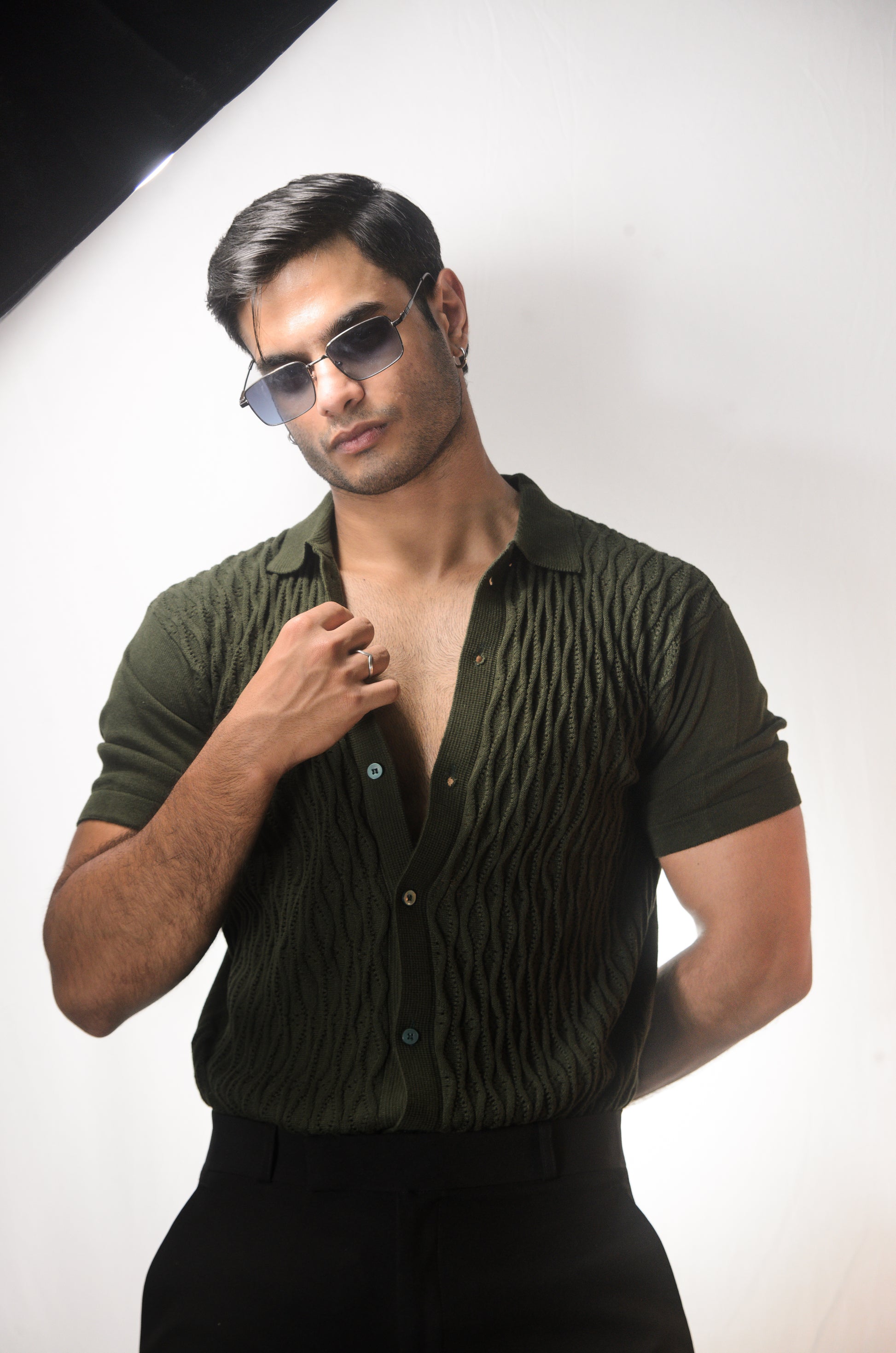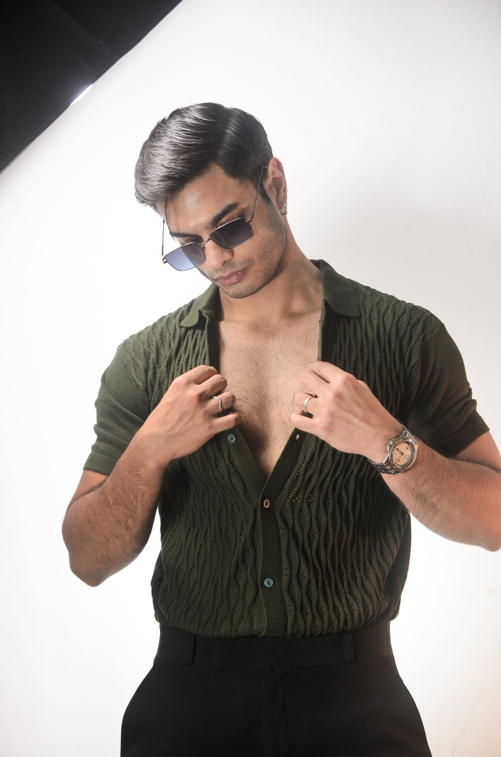 Diamond Stitch Knitted Shirt - OLIVE GREEN