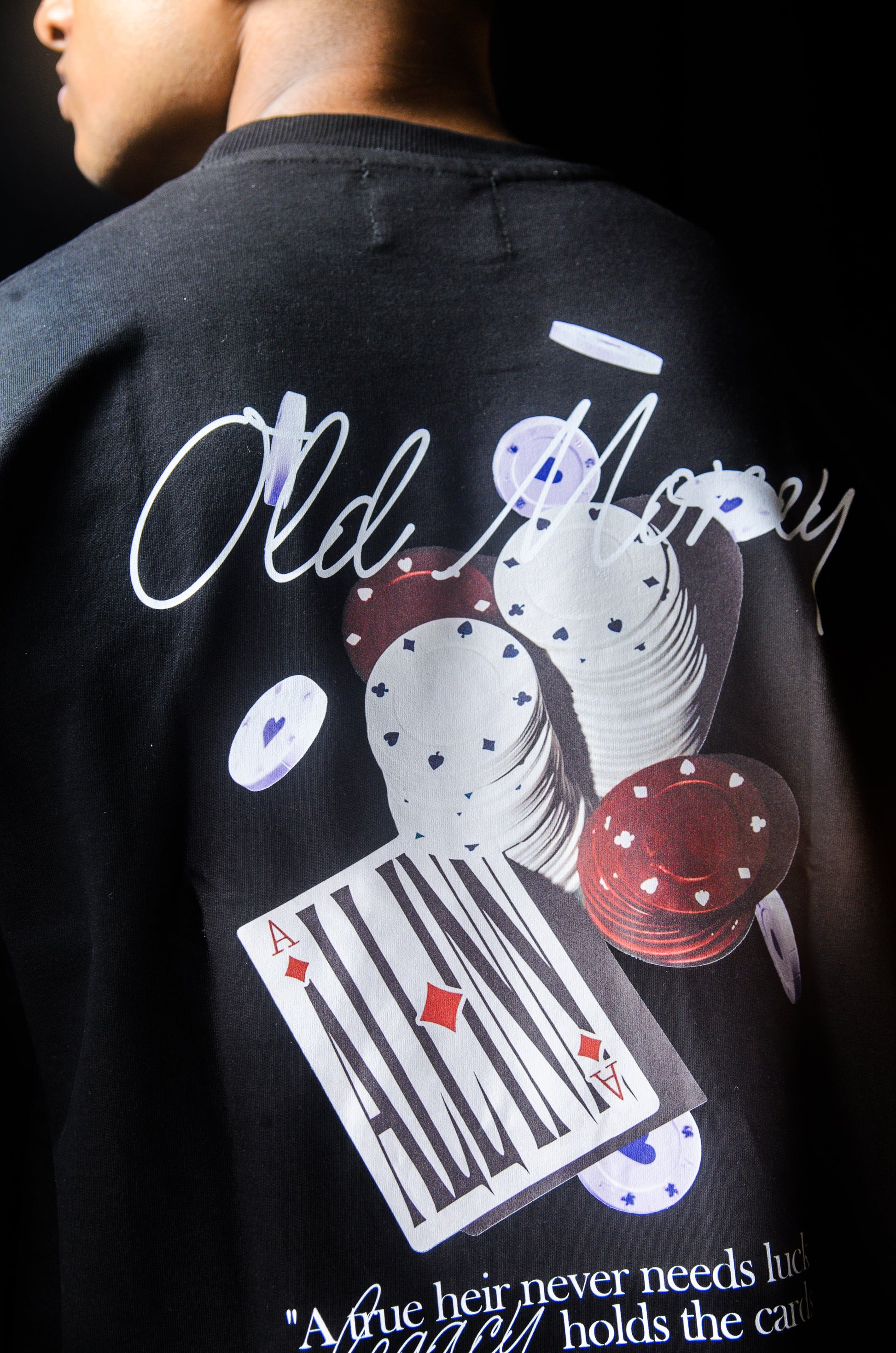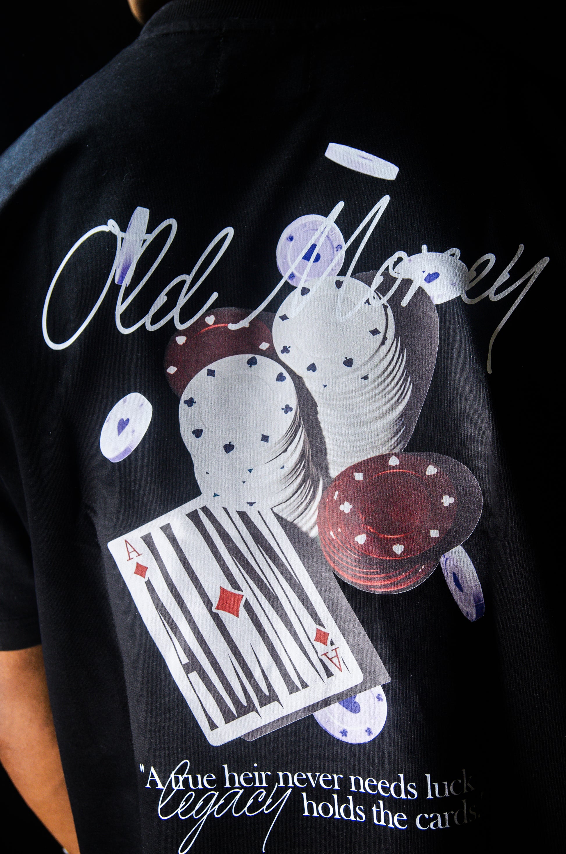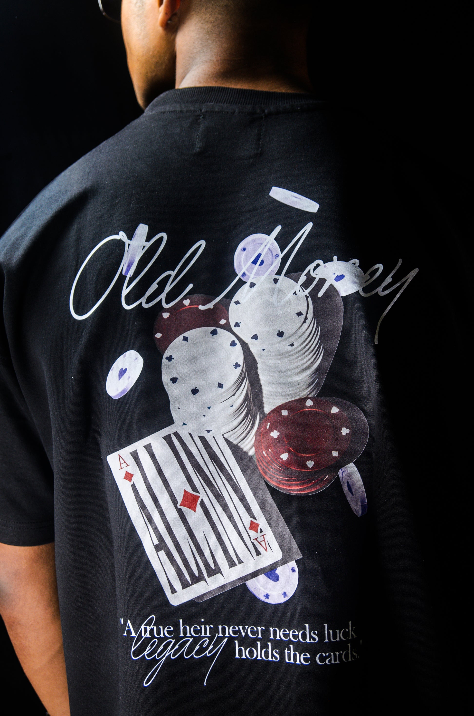 Featuring a bold poker-inspired graphic with playing cards and chips, layered with the phrase “A true heir never needs luck—legacy holds the cards”, this tee embodies timeless confidence and understated luxury.